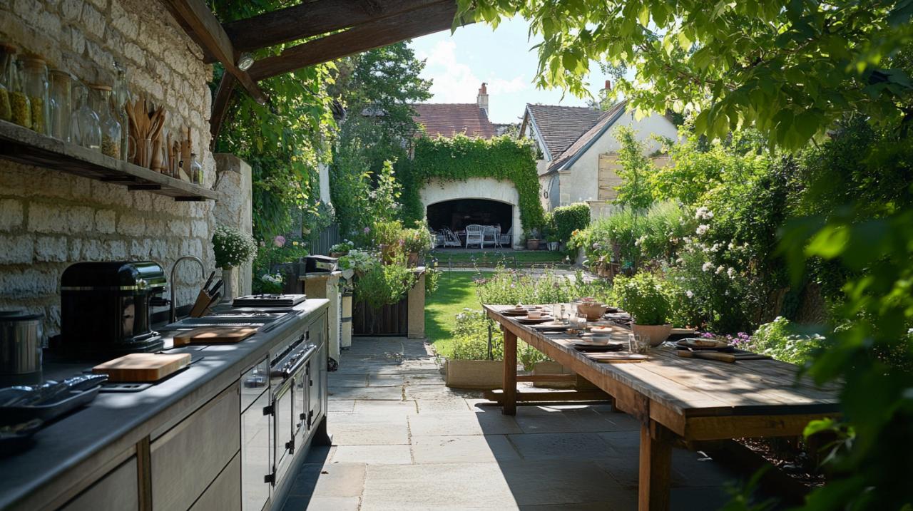 Aménager efficacement votre terrasse améliore considérablement l'aspect pratique et esthétique de votre cuisine d'été. Installez des zones distinctes pour la cuisine, le repas et la détente. Pensez à ajouter des éléments décoratifs comme des pots de fleurs, des jardinières et des éclairages doux pour créer une ambiance chaleureuse.